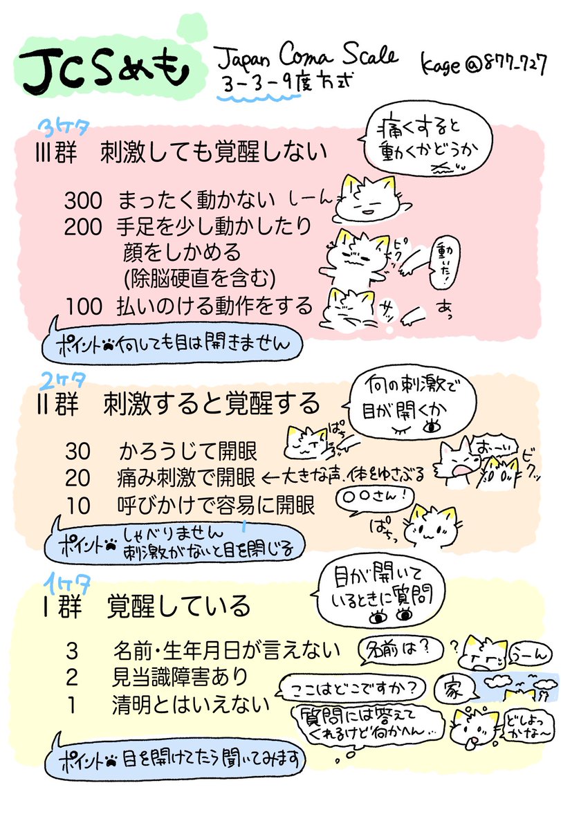 28 161 【JCSを覚えようメモ】ジャパン・コーマ・スケール ・数字が大きくなるほどやばい ・まずは3ケタ→刺激しても覚醒しない/2ケタ→刺激すると覚醒する/1ケタ→覚醒していると頭に入れたあとに細かいところを覚える ・救急や急変時に使うのでしっかり頭に入れておく 印刷してOKです🐱!覚えよう!! 23/04/09 19:09