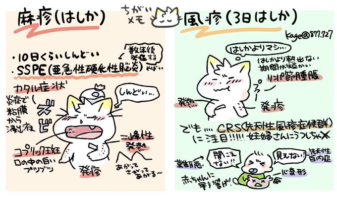【麻疹と風疹ちがいメモ】 麻疹と風疹はどちらもウィルスによる急性の全身感染症で発疹と発熱がおこる。どちらも合併症があるけれど違うウィルス。 麻疹(はしか):SSPE 亜急性硬化性全脳炎 風疹(3日はしか):CRS先天性風疹症候群