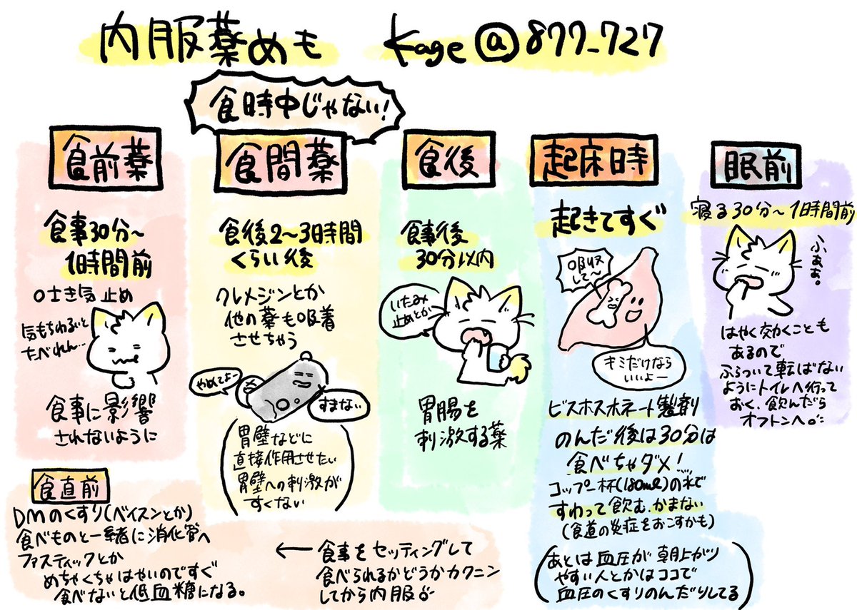 「食間薬は食事中ではなくて食事と食事のあいだ(食後2〜3時間)」というのは看護学生のときに知ったことのひとつ。普段飲まない時間なので知らなかった…🫠 患者さんに「食間薬ってご飯半分食べたら飲めばいいの?」と聞かれたりすることもあったり。初めての内服は種類だけでなく飲み方も確認しておく