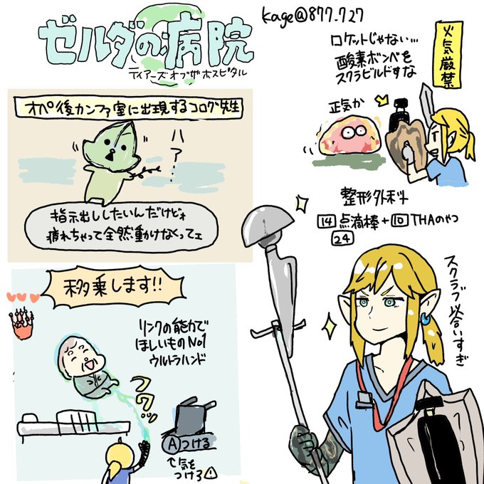 【ゼルダの病院】 ティアキンをやりたすぎて『院内でスクラビルドするならどの組み合わせが強いか』とか『カンファ室でのびてるドクターがコログに見える』し『ウルトラハンドは移乗に便利』とかばっかり考えてしまうのでらくがきしたやつ