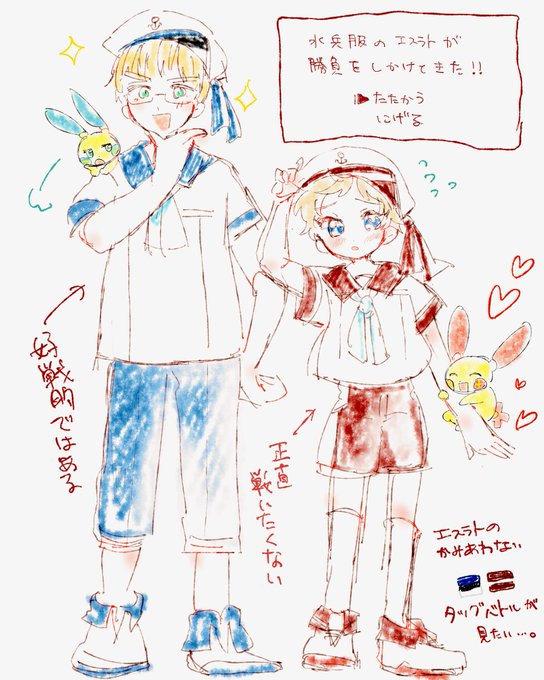 6 35 エスラトの水兵服のデザイン考えてたらプラスるとマイナんも一緒に……🫠 そんなクロスオーバー落書き #hwsEstlat 22/07/01 14:15