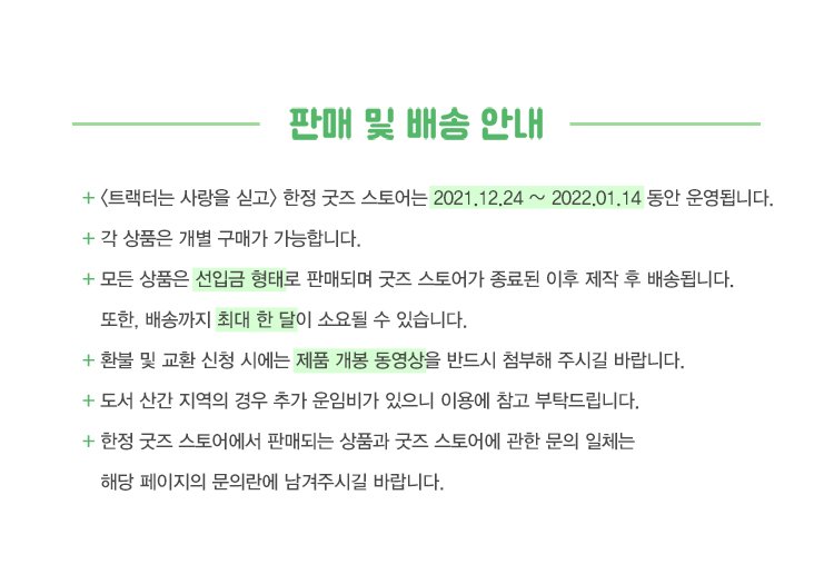 <트랙터는 사랑을 싣고> 특별 이벤트🚜🚜🚜 씨엔씨레볼루션 카카오톡 스토어에서 ※한정 기간※동안 트랙터 굿즈 5종을 판매합니다. 12/24~1/14, 다시 없을 기회를 놓치지 마세요! (‼️오늘 밤 자정에 상품이 공개됩니다!) store.kakao.com/cnc/products