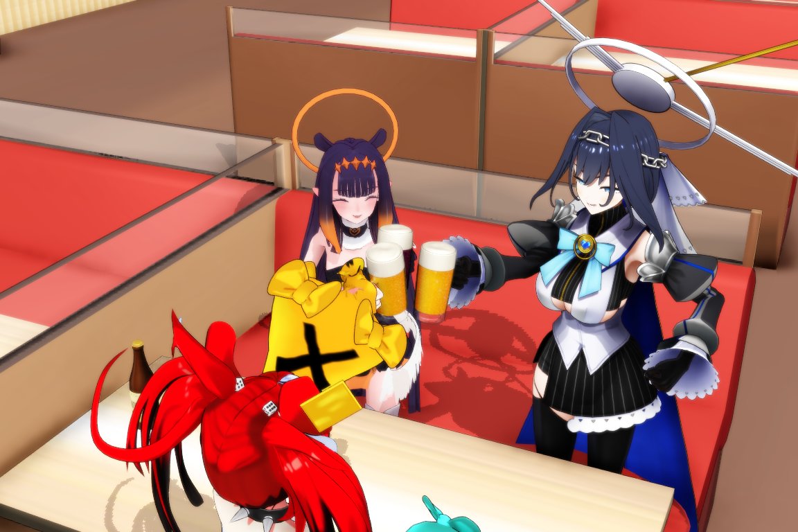 乾杯 🍻😊 #BaelzBrush #kronillust #inART #KFPicasso #callillust Models: Bae🎲 - Antro3dcg Kronii⌛️ - Warpstar Ina 🐙- llay11a Calli💀 - genoge_cg Kiara 🐔- へびーねこ Drink sets アルコール・パッケージ - ましまし スムージーセット - キャベツ鉢 Family Restaurant - amiamy111