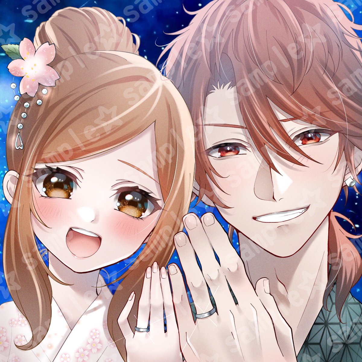 13件目のご依頼! 星の桟橋でプロポーズした後に撮った写真をイメージした1枚でした💍💕 幸せそうな2人の表情がお気に入り(* ´ ꒳ `* ) アイコンにご利用との事だったのでお渡ししたのは明るい方だけど、逆光差分も🙋♀️✨ ありがとうございました! #有償依頼募集 #有償アイコン #夢絵 #イラスト
