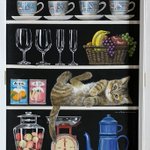 お気に入りの場所3 人気の絵で、作るとすぐ売れるしうちの猫でお願いと言う依頼も来ます。 棚で寝てるとか、猫飼っている人のあるあるなのかな?😊 アクリル絵の具