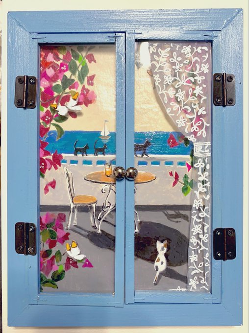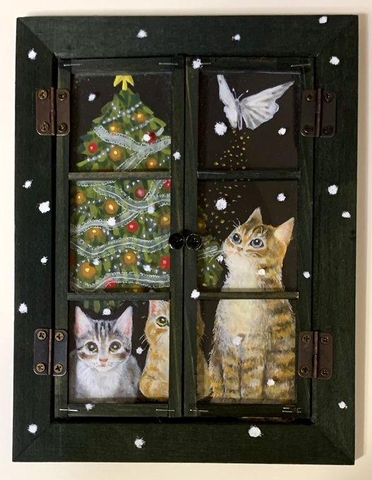 小さな猫が3匹になって 窓辺にすわりました✨✨ 小さな窓に、小さな猫達 可愛い可愛い小さな世界😊 アクリル絵の具