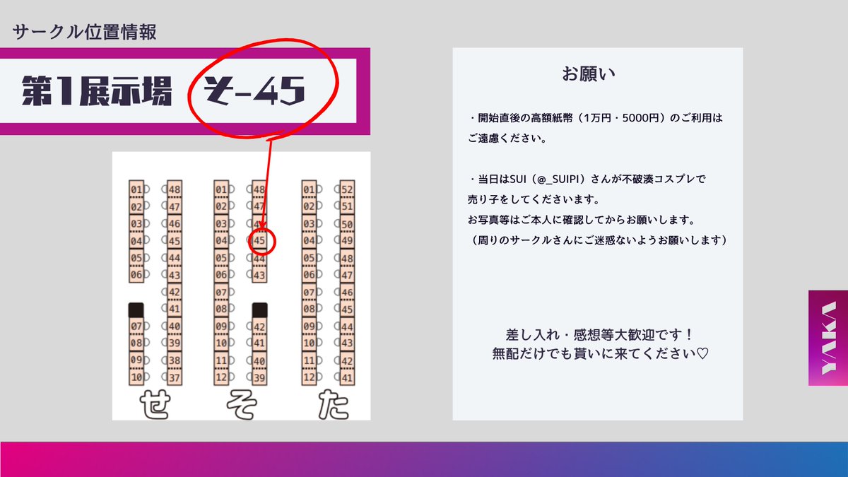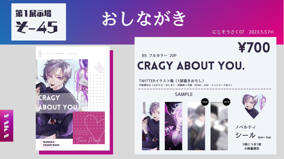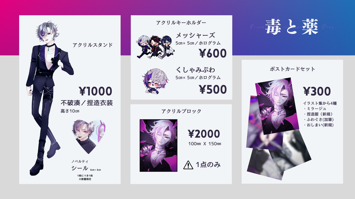 9 17 【お品書き】#にじそうさく07 ⛓そ-45 |毒と薬。 ■Twitterまとめイラスト集(新規絵あり) B5|フルカラー|20P |700円 ※数量限定ノベルティ 他アクスタ/アクキー/ポストカードセット/無配 ツリーに実物写真載せます。 当日はsui( #_suipi)さんが売り子です💜✨ 23/05/03 00:32