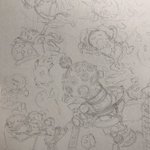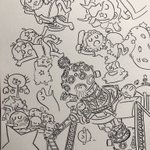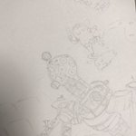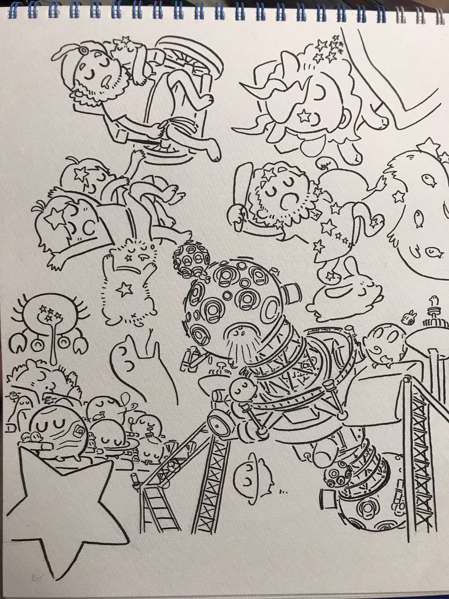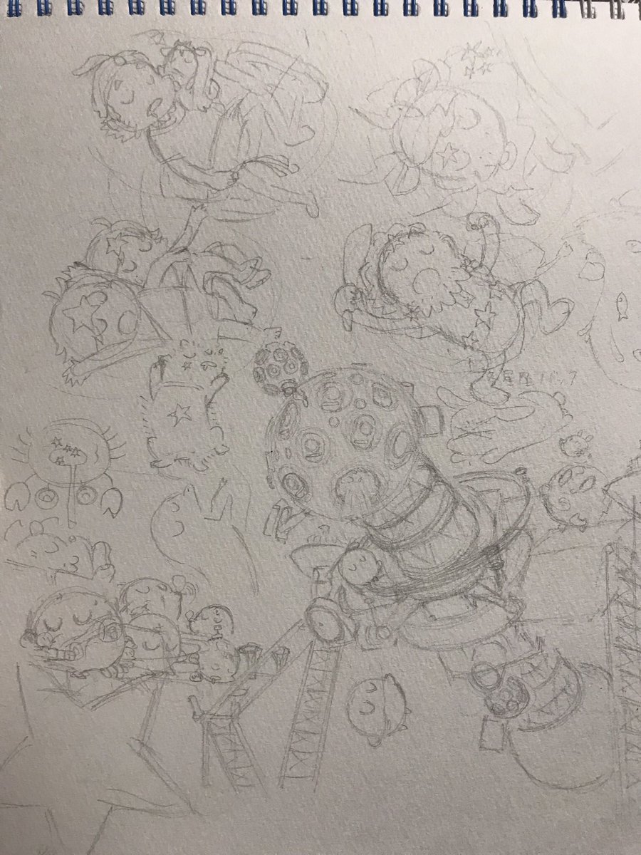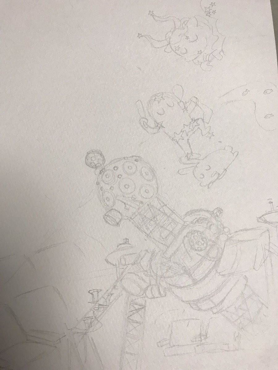 10 37 熟睡プラ寝たリウム ポスターイラスト線画までの工程 ①あ!イエナさんの向き違くない⁉︎ ②恒星球の中はこうせい!なんつってな〜(太陽描き込み) ③下書きこんなもんかな? ④でけた! この後PCに取り込んで位置を直したりなどして着色して完成! 22/11/11 11:40