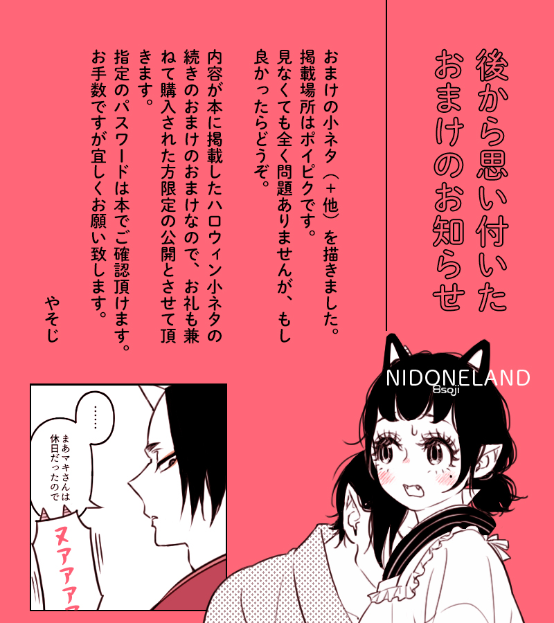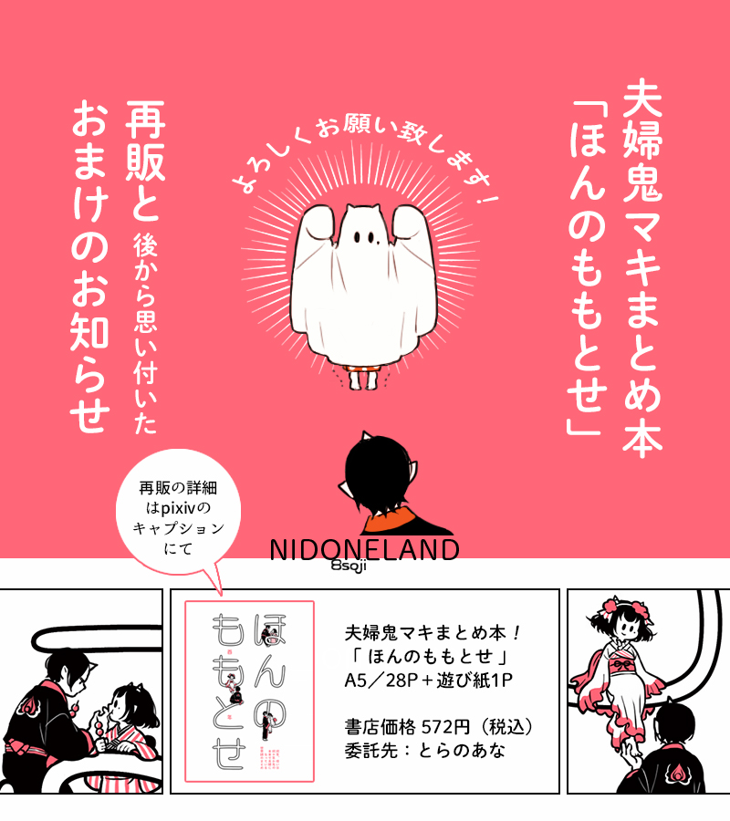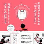 夫婦鬼マキ本、再販分も完売しました。初版と合わせ沢山の方に手に取って頂けました。ありがとうございます。ちょっとしたものですがおまけの小ネタもございます。知らなかったよという方は是非見てやってください。 👹🍑おまけ掲載場所(ポイピク/鍵付き):poipiku.com/877103/7705632…