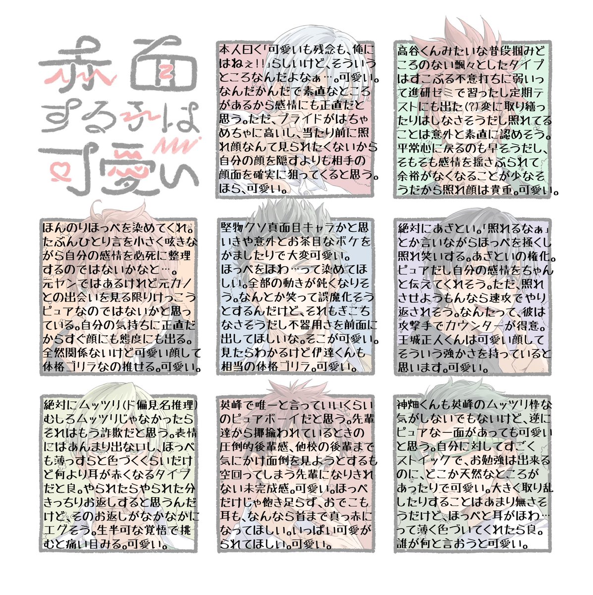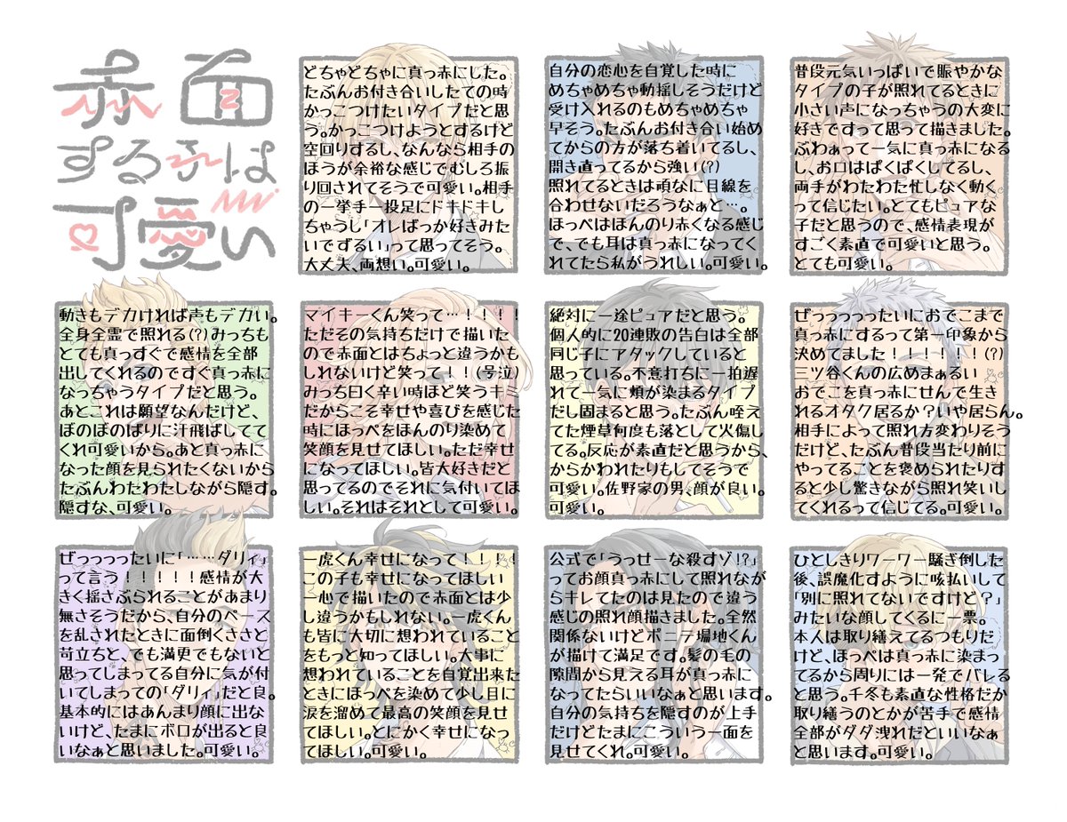 やっと描き終わりました~!推したちの赤面は健康にいいし可愛い。めちゃめちゃ楽しんで描きました!リプ下さったフォロワっさんありがとうございました♡3,4枚目は描いた感想とか妄想なので読んでも読まなくてもいいやつです。夢でも腐でも好きな解釈で見てくれよな…!! #赤面する子は可愛い