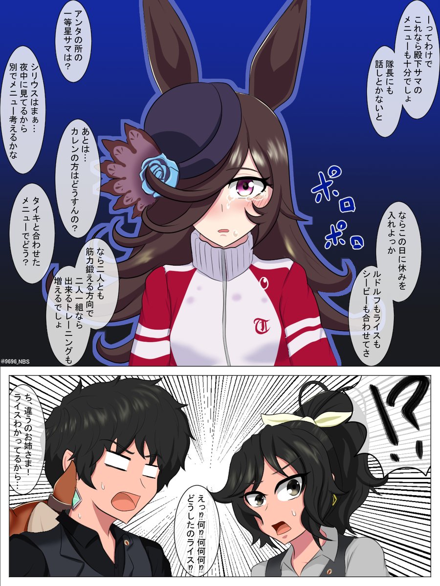 ライスのメンタルつよつよトレーニング(3) 姉「快調に見えるのに…」 ルドルフ「ふふっ会長に快調とはお義姉さんもなかなかセンスがあるな」 姉「やかましっ」 次回おまけへ逸れます #ウマ娘 #ライスシャワー #シンボリルドルフ #イラスト好きな人と繋がりたい #絵描きさんと繋がりたい