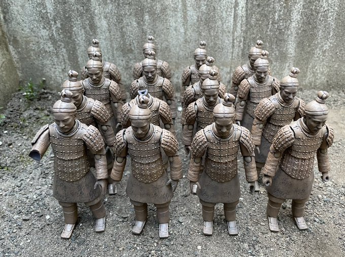 セット買いした兵馬俑ですが、この1回で「16体のfigmaを袋から出してそれぞれにポーズを付けるともう疲れる」と思い知ってしまったので内9体を手放しました。7体に絞ったのは僕が三代目J SOUL BROTHERSのファンで三代目の振付とかして遊びたいからです。 twitter.com/96sukekiyo/sta…