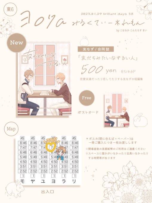 ☕️1/29 ブリデ38 お品書き🍋 東6ホール ヨ07a みるくてぃー*れもん まいさん、こんたろすさんとの合同スペースです🐰 当日はよろしくお願いします! 合同誌サンプル→ pixiv.net/artworks/10445…