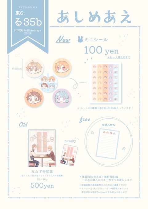 💐5/3ブリデ お品書き🐇 *東6ホール る35b あしめあえ ラビのグッズと既刊の合同誌を頒布する予定です♡⃛ 当日はよろしくお願いします! ◽︎グッズサンプル:pixiv.net/artworks/10763… ◽︎既刊合同誌サンプル:pixiv.net/artworks/10445…