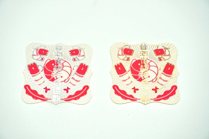 【拡散希望です🙏】 めっちゃ素敵な箔押しシールを信陽堂様(@shinyodonet )に作って頂きましたー!✨🦐✨ アマビエ様ならぬ甘エビ様の疫病退散デザインが箔押しに…! 中央の文字は甘海老様疫病退散と書いてあります! シルバーとゴールドの2種の箔押しです✨ 箔押しなので神々しさがすごい😇✨ twitter.com/i/web/status/1…