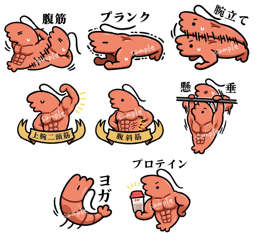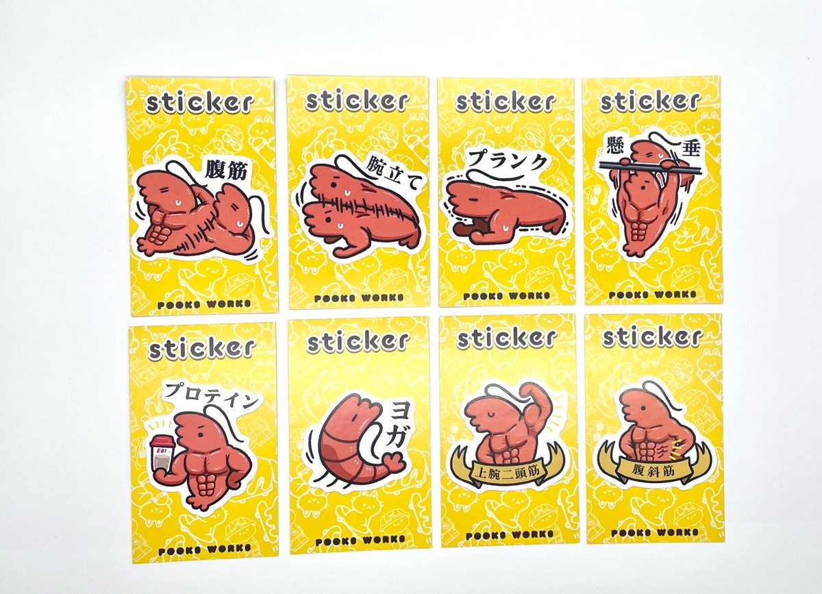 そして同じく4/23(日)〜 江古田のふたばねこさん(@futabaneko )で開催する #からだにいいこと展 が始まります! むきむきえびの筋トレシリーズのステッカーで参加予定です💪🦐💪 むきむきえびのぬいぐるみストラップもあるよ💪🦐💪