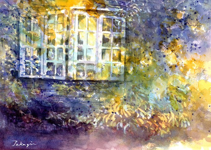 窓辺のあかり、暖かそうな光に包まれたガーデンを描いてみました。 #水彩画 #透明水彩