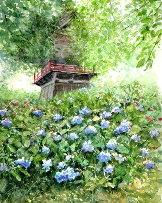 熊谷市妻沼の毛護寺のあじさいです。7月に途中まで描いてそのままにしていたので、ここでやっと仕上げ、結果はともかくホッとしました。 #水彩画 #透明水彩画 #あじさい