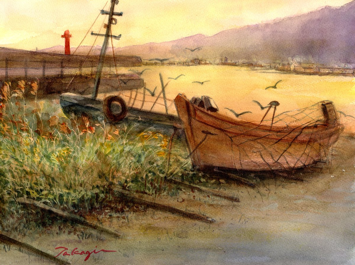 少し前に描いた作品で、礼文島の小さな港の夕景です。 #水彩画 #透明水彩画