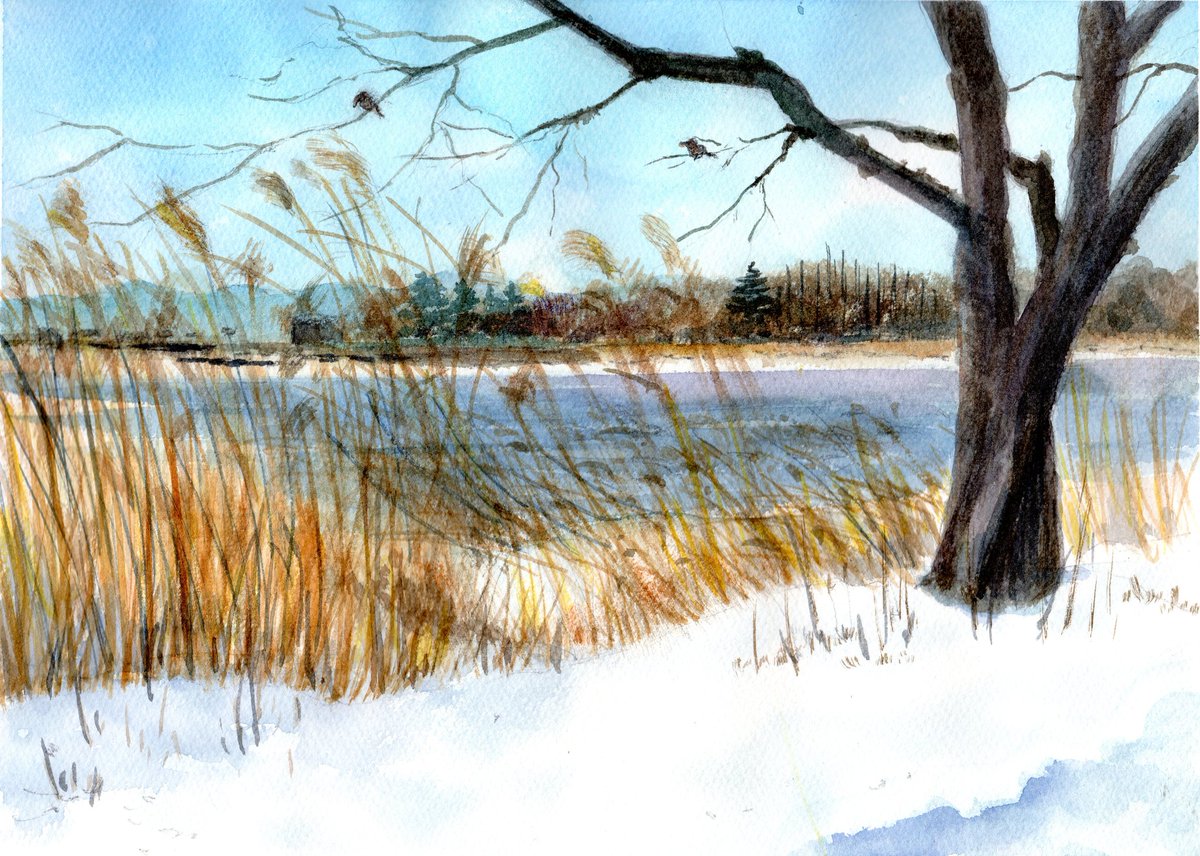 9 52 「雪の伊佐沼」 四季折々に表情を変え、楽しませてくれる伊佐沼です。遠くまで行かなくても、絵になる表情を見せてくれるところがいいなと思ってます。2年前に雪が降った時に描いた一枚です。 #絵画 #水彩画 #透明水彩 19/12/24 23:23