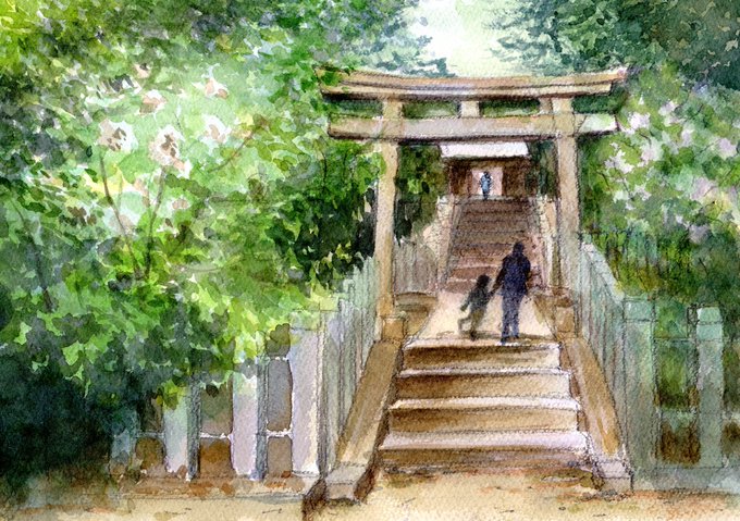 近くの神社にて #水彩画 #透明水彩画 #絵画