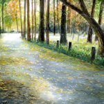 東京大学赤門を入ったところの銀杏並木が黄葉の始まった頃、緑と黄色の混じる光景に惹かれ描いてみました。