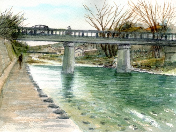 栃本親水公園で相生橋を見ながら槻川の流れを描いてみました。槻川は和紙づくりの小川町とよくマッチしているように感じます。 #水彩画 #透明水彩画 #スケッチ #小川町 #栃本親水公園