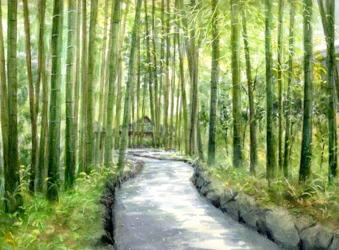 大宮、氷川神社近くのギャラリーの入口から竹林を描いてみました。 #水彩画 #透明水彩画 #風景画 #竹林