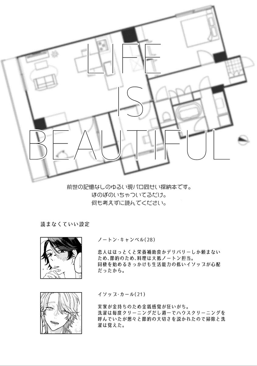 5/4超残狂の新刊サンプルです。現パロ同棲のペラ本です🤘 何事もなければ出ます🙏よろしくお願いします! 「ライフイズビューティフル」 探納/全年齢/A5/20P/300円 (1/3)