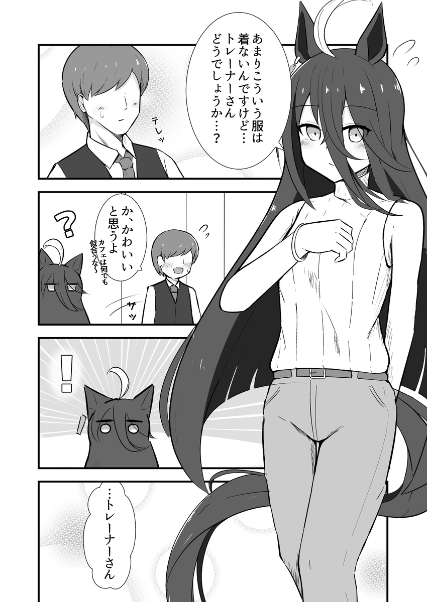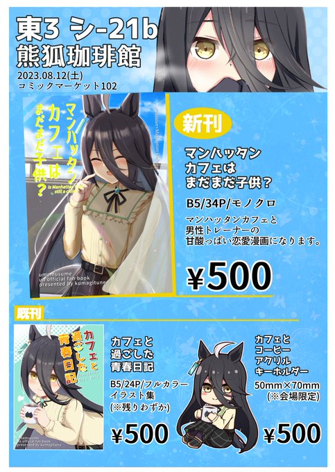 C102新刊の予約受付が開始しました。 マンハッタンカフェと男性トレーナーの甘酸っぱい恋愛漫画になります。 よろしくお願いします。(1/2) メロブ→melonbooks.co.jp/detail/detail.…