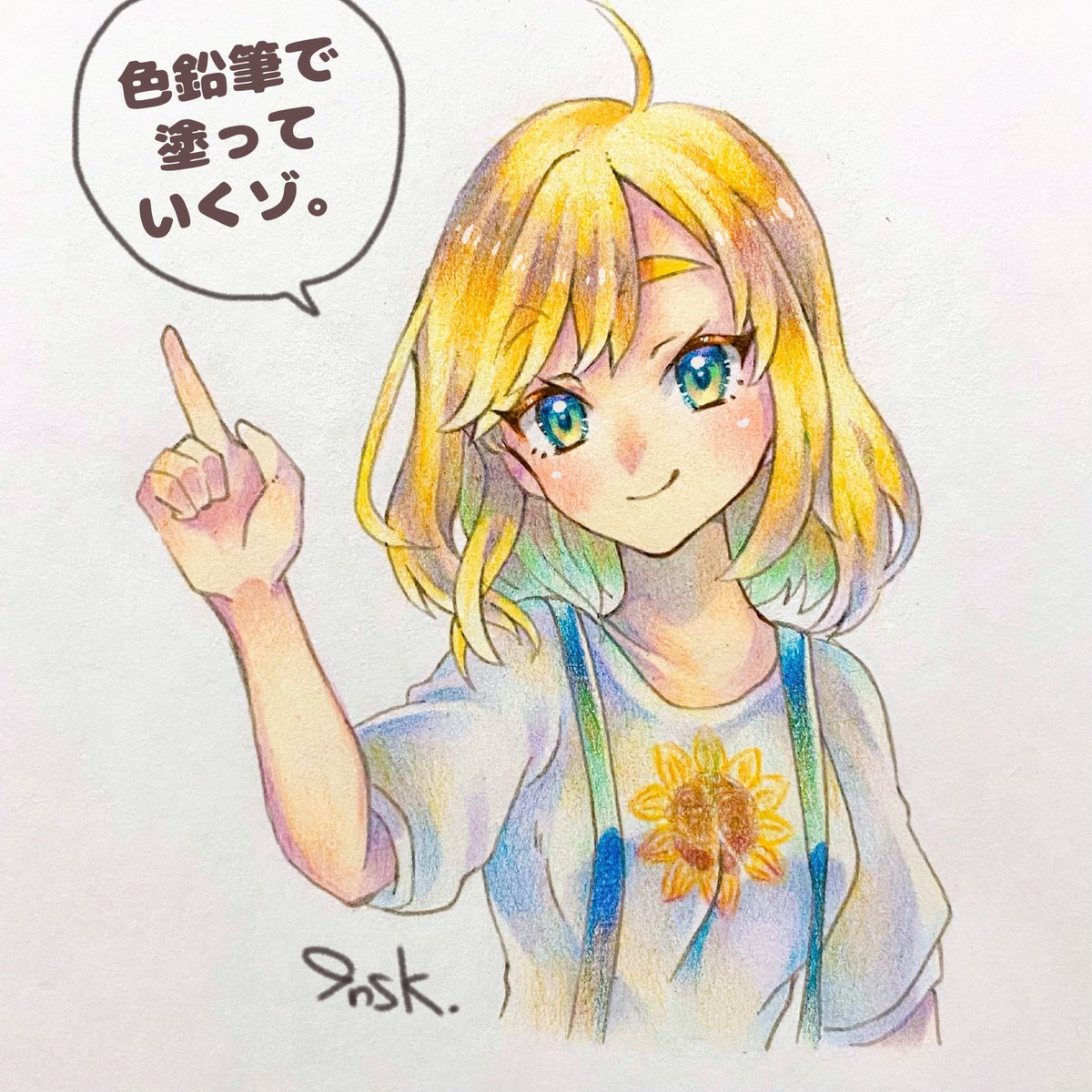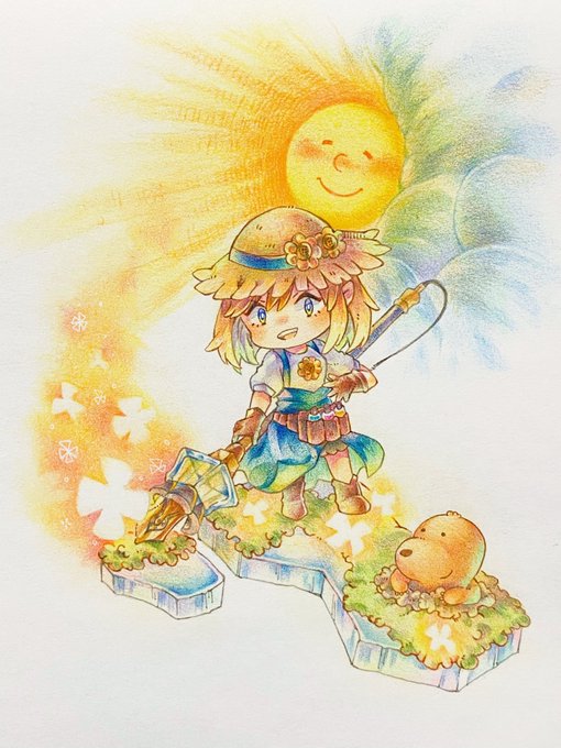 みのりえむ様(@mdr2m )の素敵な線画を色鉛筆で塗ってみた🥒 バランスの良いデフォルメイラストにマッチするよう、塗りもデフォルメされた感じを意識してみました!光の在り処が伝わる一枚になっていれば嬉しいです。ご参加ありがとうございました! #色鉛筆布教するゾ