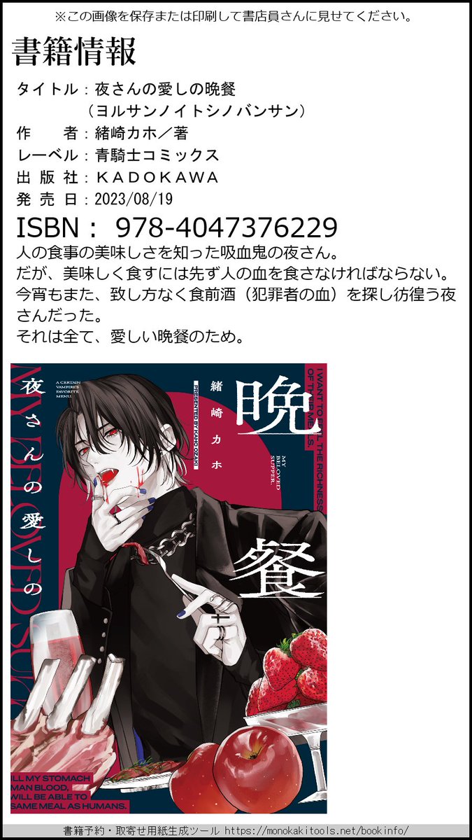 発売中の「夜さんの愛しの晩餐/青騎士コミックス」 第1話でした! 人の食事をこよなく愛する吸血鬼夜さんのちょっと不思議な日常をぜひ読んでください~🍷❤️🦇 Amazon→amzn.asia/d/8S2Z0Ka