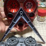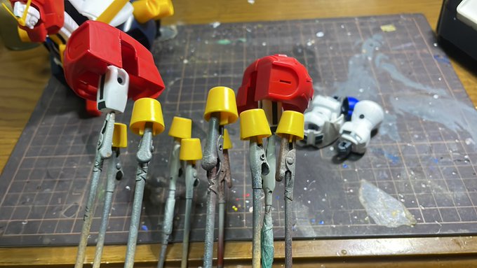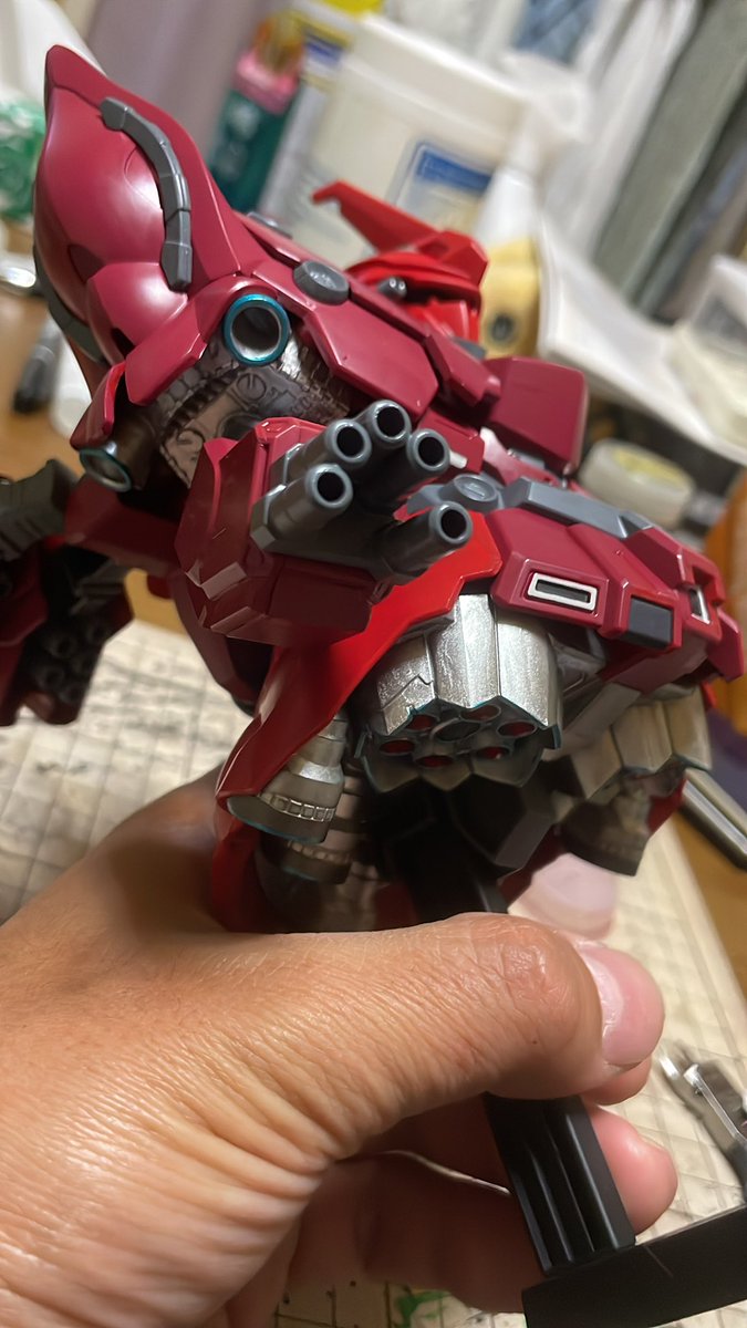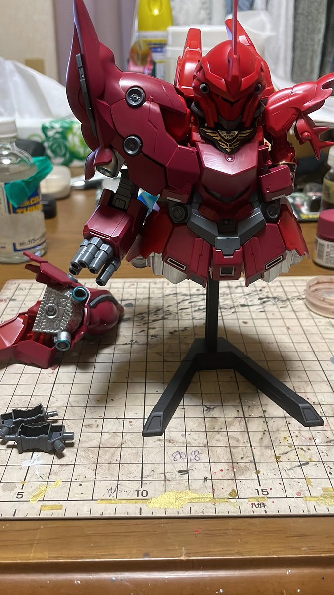 デビルガンダムの作業ここまで。 筆塗り塗装なので進みが悪い😅 やっと両腕の塗装が終わりました。 残りは2枚目に写ってる本体と脚部です💦 #ガンプラの画像貼るとRTされると聞いて #ガンプラ好きと繋がりたい #ガンプラ