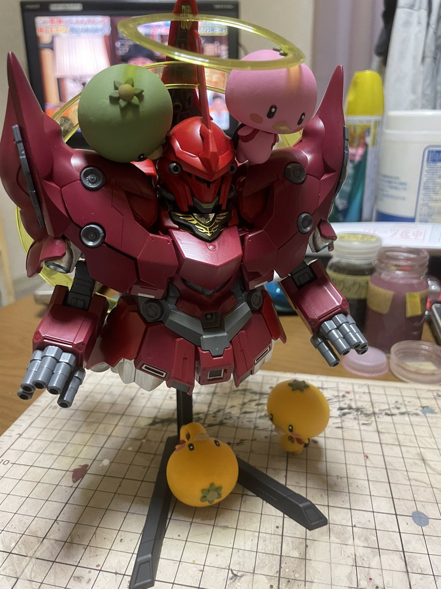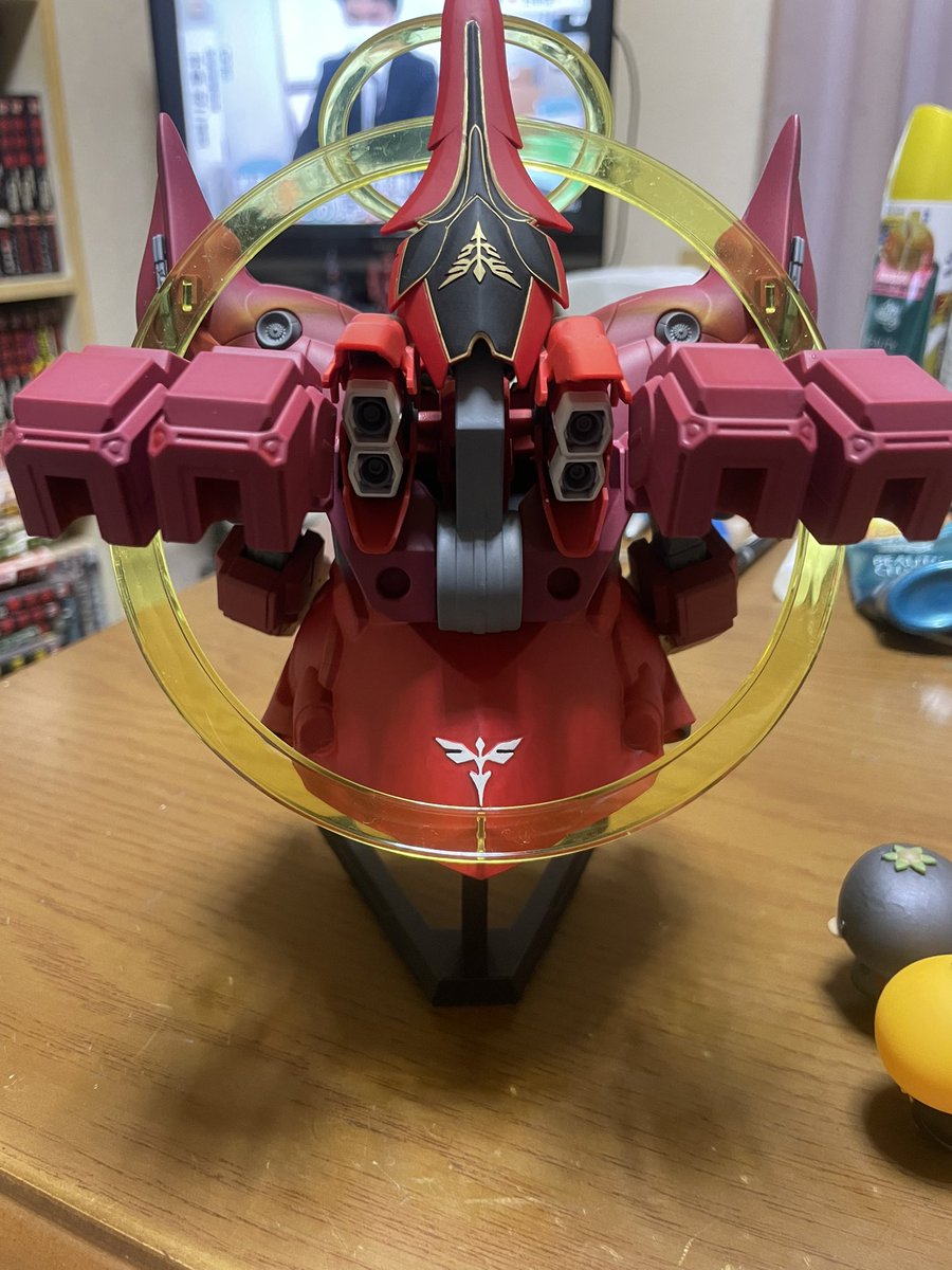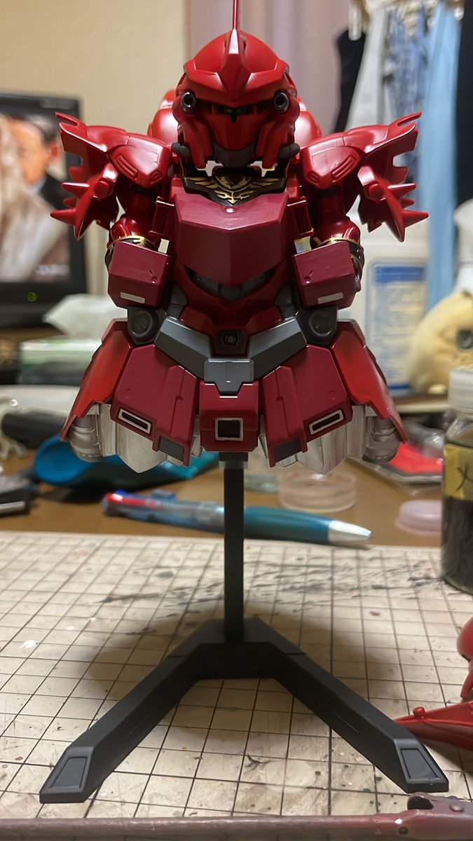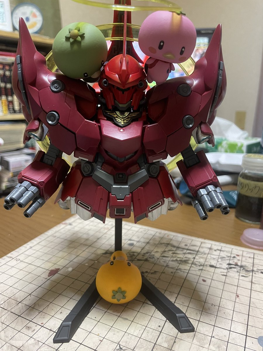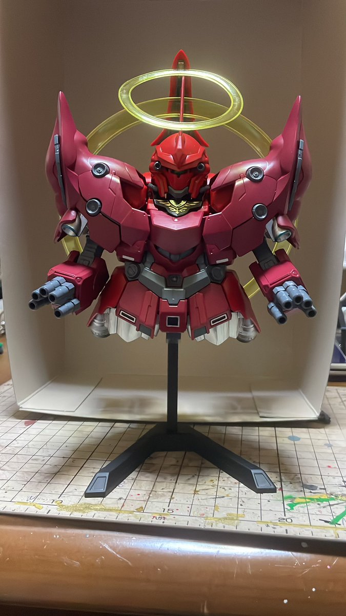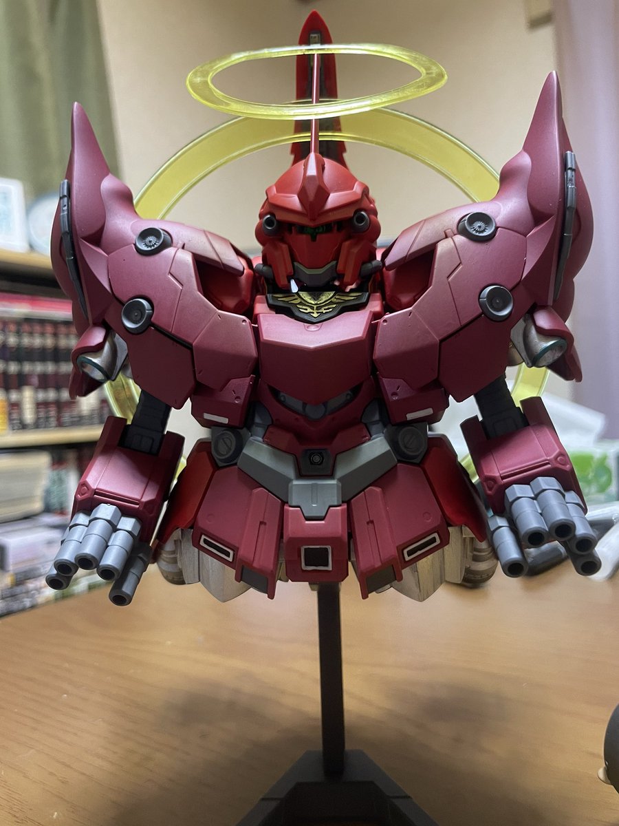 つや消しトップコート吹いたのでゴールドなどのメタリック色がフラットになりシックになりました🤗 シナンジュ含めて筆塗り塗装で仕上げました。 ジオンマークも全て筆塗り塗装です👍 #ガンプラはどんな自由な発想で作ってもいいんだ #ガンプラの画像を貼るとRTされると聞いて #みかんかっぱ