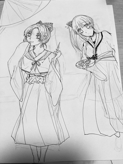 今日描いたイラスト 卒業式袴着るの楽しみ過ぎてしのぶちゃんとカナヲに着せてあげました☺️ #はいから #袴 #鬼滅の刃 #女性のイラスト #水彩画 #下書き