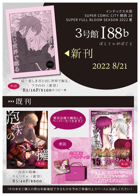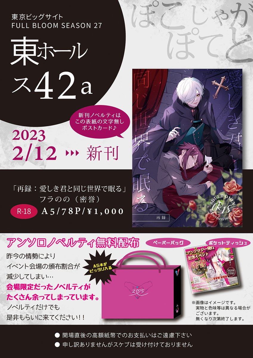 4 4 お品書き 【2/12 FBS27】密誉(フラのの) SP:東ホール ス42a 【ぽこじゃがぽてと】 新刊サンプルはツリーのpixivへどうぞ! アンソロのノベルティの件、かなり切実です😭💦 遠慮せず気軽にもらってください~!🙇♀️ 23/02/05 21:17