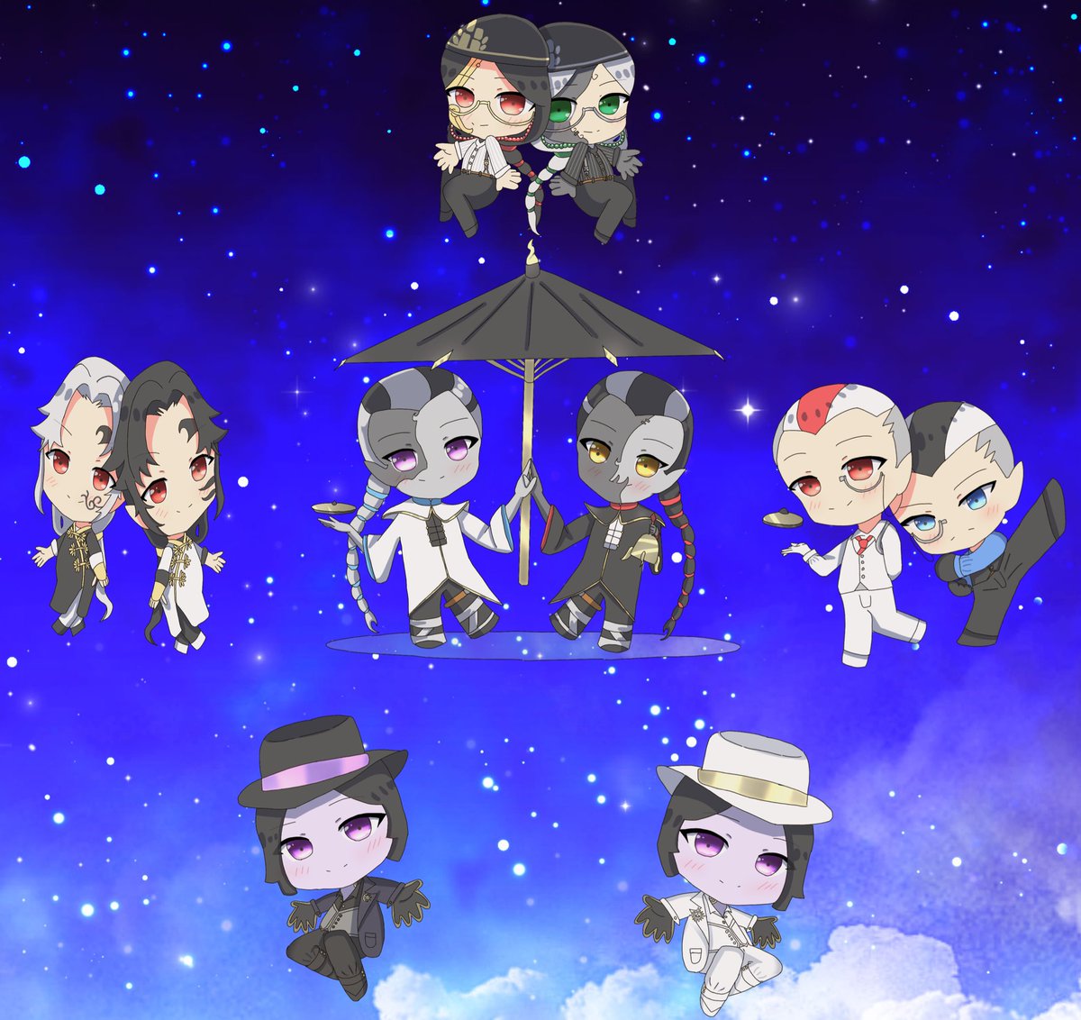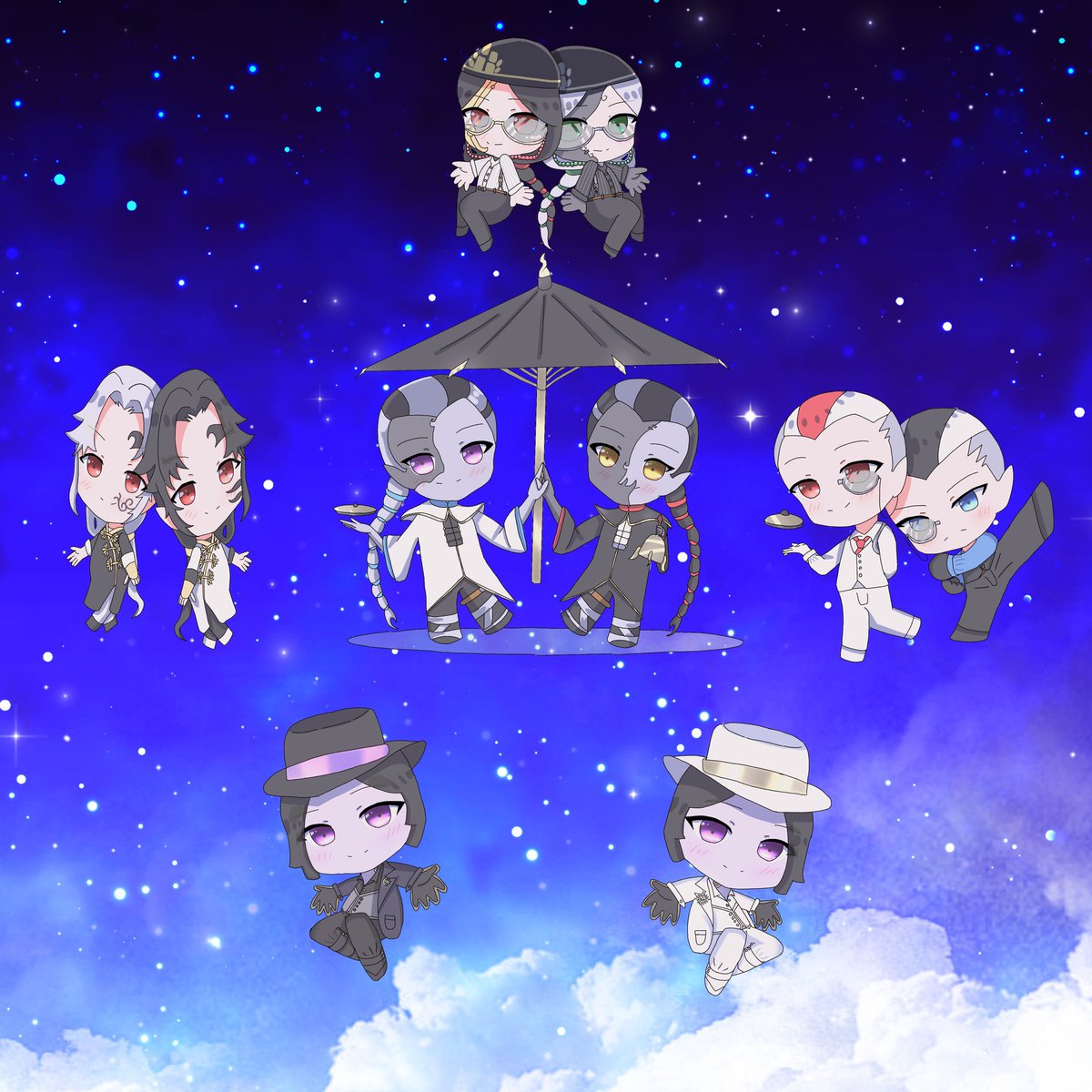 #白黒無常記念日2021 今年全員は、描けなかったけど新衣装と星形に配置して描いてみました!誰よりもあなたたちの幸せを願ってるいます。白黒無常さん記念日おめでとうございます(๑´ω`ノノ゙ぱちぱち☆