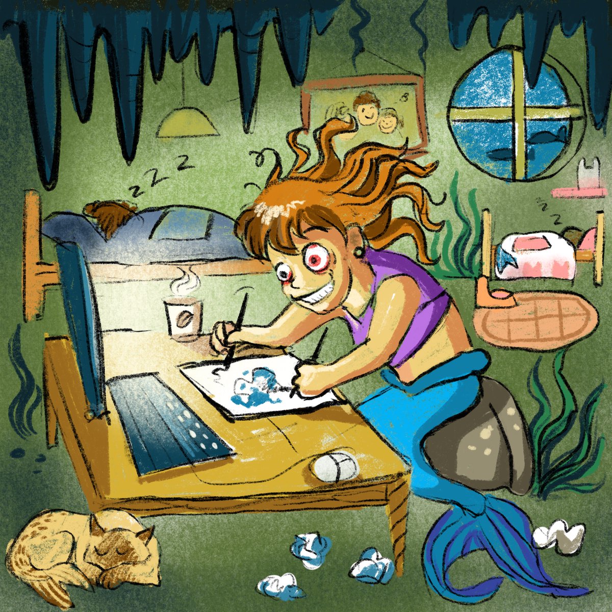 Theme #obsessed for the 28th day of Mermay. In this humorous sketch, a self-portrait. 4 am, everyone has been, but it is impossible to break away from my favorite business))) #28day @mermay_official #MerMay #MerMay2021 #wacommermay2021 #wacom #mermaid #alinart #worktoorder #dm