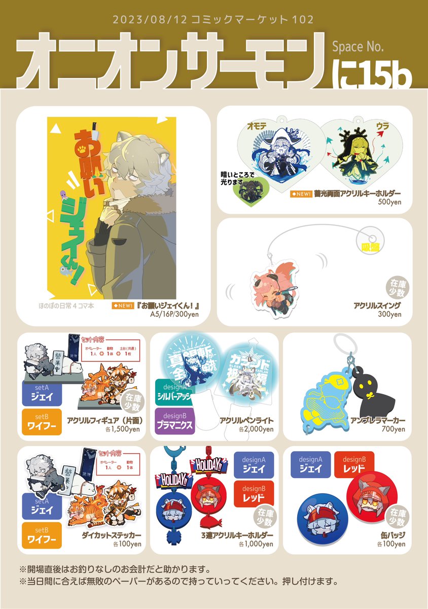 【お品書き】 23/8/12(土)コミックマーケット102 #C102 スペース:西1に-15b サークル:オニオンサーモン 🧡後日通販:なし 🧡次回イベント:10月名古屋オペサス 🧡スケブ:受付無 💛撤収13:30〜14:00予定 💛開始直後はぴったりお支払いだと嬉しいです🙏