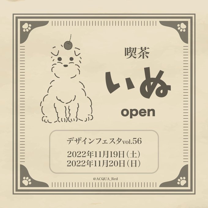 0 7 デザインフェスタvol.56にて『喫茶いぬ』OPEN!!☕️ 犬×純喫茶をイメージしたグッズを展開予定です🐶✨ お楽しみに❗️ #デザインフェスタ #デザフェス56 #デザフェス #純喫茶 #カフェ #いぬいらすと #犬 22/09/02 14:39