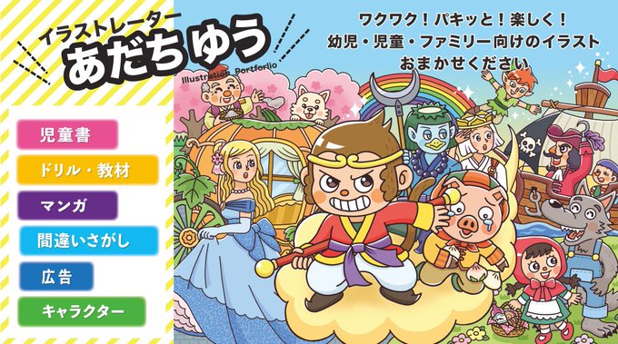 #PortfolioDay イラストレーターのあだちゆうです🌼 ワクワク!パキッと!楽しく!幼児・児童向けのイラストを描いています! 物探し・間違い探し・迷路などアイテムいっぱいのわちゃわちゃ楽しいイラストが得意です。 WEB adatiyu.com