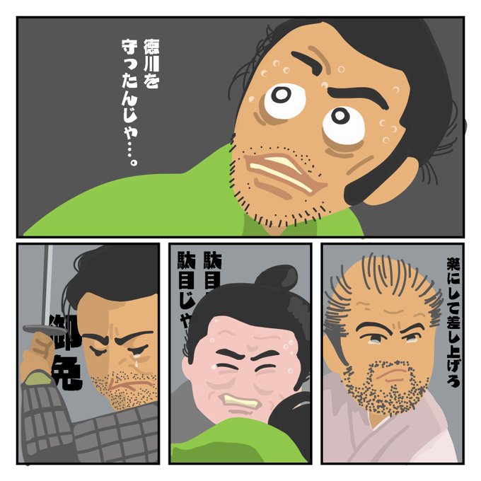 63 159 家康、平八郎、小平太を描きました。 漸く家康描けた。 あんまりカッコ良い場面ではないけど。 早どうしたけど、どうなるのコレ。 #どうする絵 #どうする家康 23/02/26 19:15