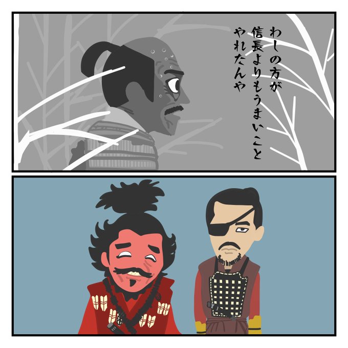 85 308 明智光秀の最期と、怪し過ぎる甲賀衆を描きました。 キャストが発表された時から楽しみでしょうがなかった酒向芳さんの明智光秀。最後まで最高でした。 甲賀衆、いい人達だったのにね。 #どうする家康 #どうする絵 23/07/31 22:34
