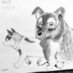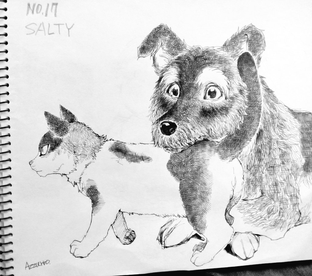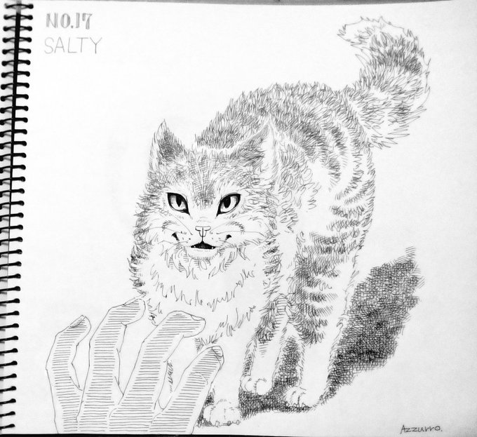 #Inktober_PerfectChallenge #inktober #inktober2022 #インクトーバー #筆携 #シグノ #kuretake_inktober2022 #Salty #塩対応 #猫好きさんと繋がりたい #犬好きさんとつながりたい #ペン画 17日目、ムッチャ塩っぱい猫さんと、同居犬にツンデレの猫さん、描いてみました! 完走目指して頑張るぞ!