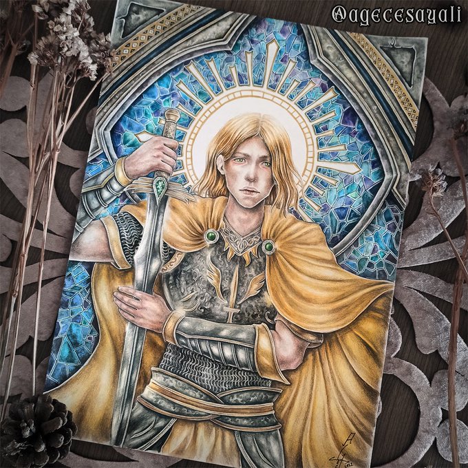 ♱ THE SAINT ♱ My OC, The Sun Knight in his favourite armor. Made with coloured pencils, watercolours and gold acrylic. 🔆 #art #HumanArtists #arttwt #fantasyart #medieval #dndart