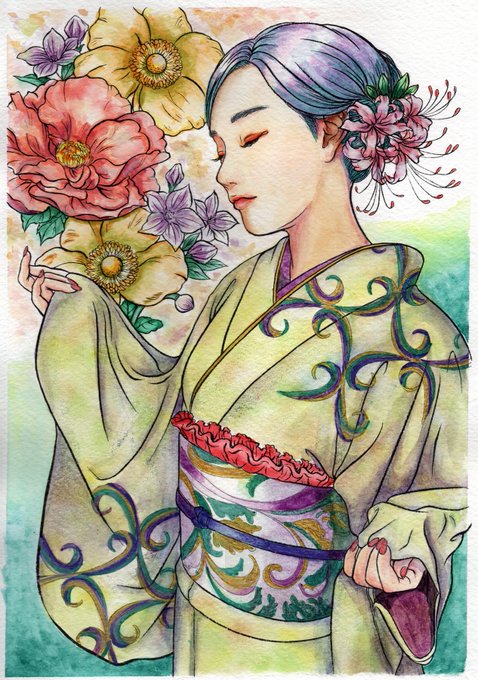 【ガチ水彩修行 その⑥】 快適アート(@kaiteki_y)さんの塗り絵BOOKで塗ってみた。その⑥ 着物の模様をラメペンで塗ったら目立ってしまい 色々ごまかしたけど無理でした(汗) #着物 #塗り絵 #水彩 #快適アート #イラスト好きな人と繋がりたい #絵描きさんと繋がたい
