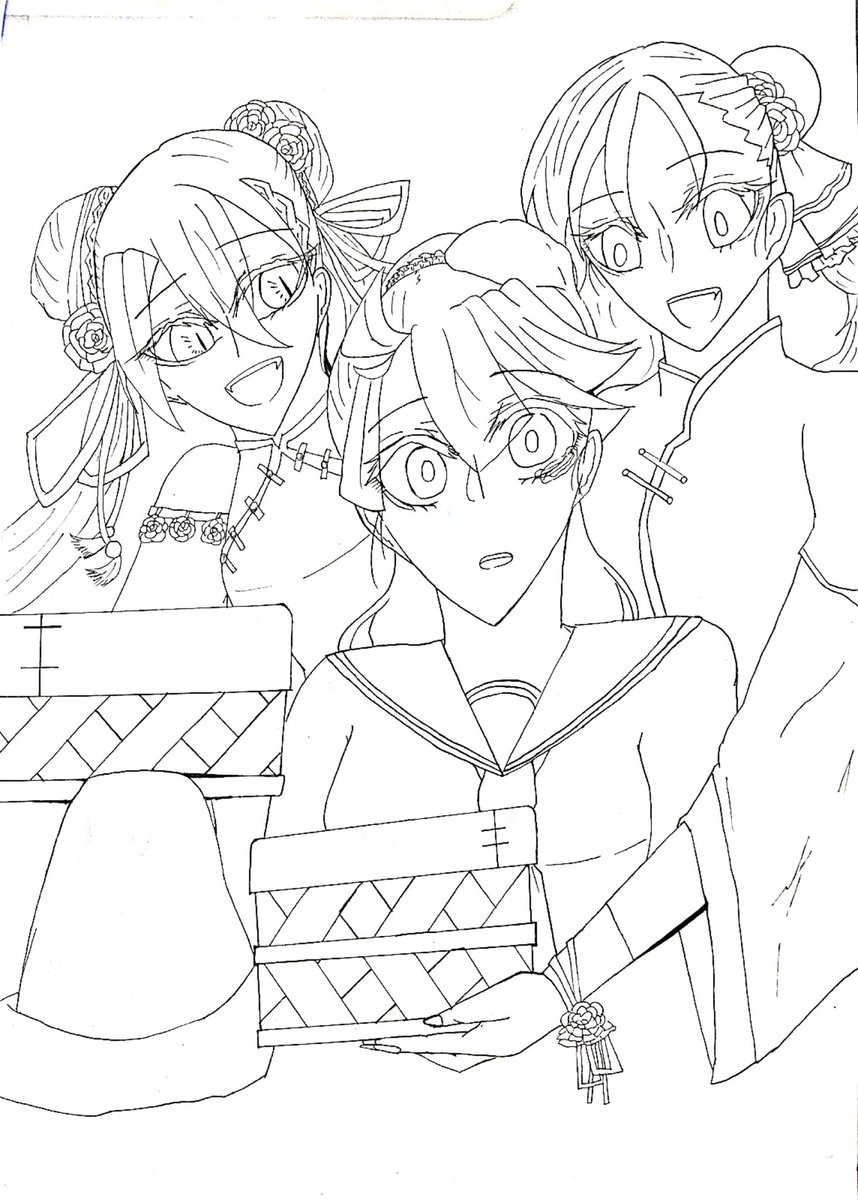 #らくがき #コピック #チャイナ服 テスト明け!久しぶりに描いた イメージ曲 チャイナアドバイス キャスト 左から 戀華(オリ 現パロ) 白南風丸♀(現パロ) 尊奈門♀(現パロ)
