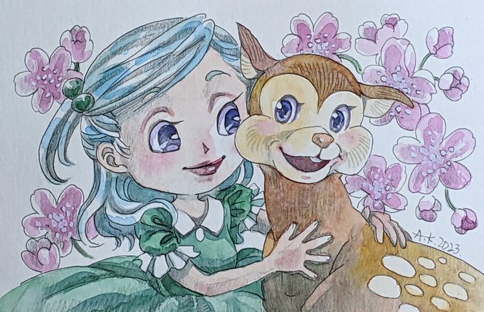 手描きイラスト オリジナル イラスト 原画 女の子 ガール 子供 花 シカ 子鹿 鹿 桜 さくら 春 植物 動物画 アニマル 🎈1.500〜販売中です🎈 #ヤフオク出品中 #原画販売 #イラスト原画 page.auctions.yahoo.co.jp/jp/auction/w10…