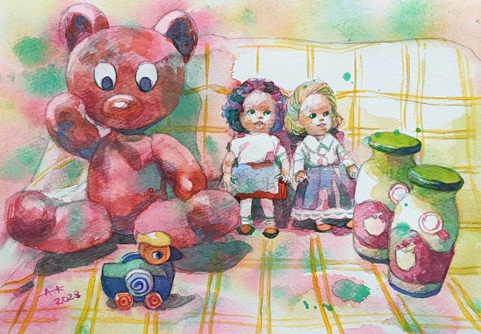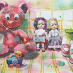 好きなものごちゃごちゃ🗃 #エフ水彩 #ぺんてる #ワトソン紙 #水彩画 #おもちゃ