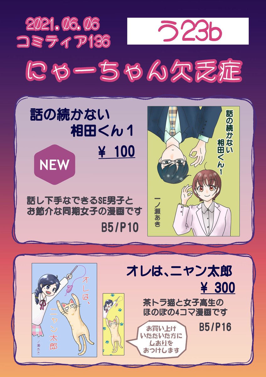 2 3 2021年6月6日に東京ビッグサイト青海展示棟A・Bホールで開催予定のイベント「COMITIA136」へサークル「にゃーちゃん欠乏症」で申し込みました。 #コミティア #COMITIA 21/03/29 04:12